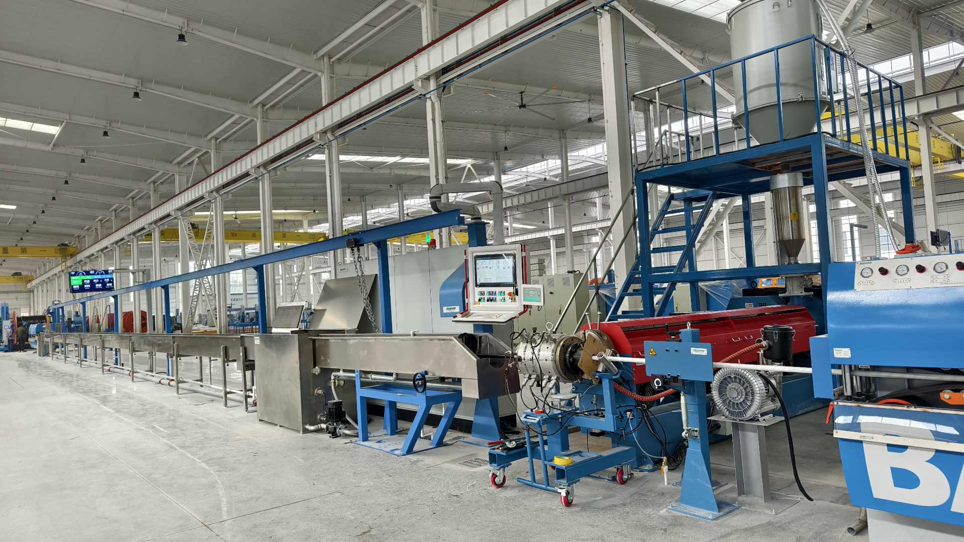 近日,漢鼎線纜設(shè)備的工程師團(tuán)隊(duì)在客戶工廠順利完成了新購(gòu)置的 EXT150-26DV 押出機(jī)生產(chǎn)線的安裝與調(diào)試工作。該設(shè)備主要用于擠出直徑在 45.0-140.0mm 之間的 PE 或 PVC 線,為客戶的生產(chǎn)流程注入了新動(dòng)力。